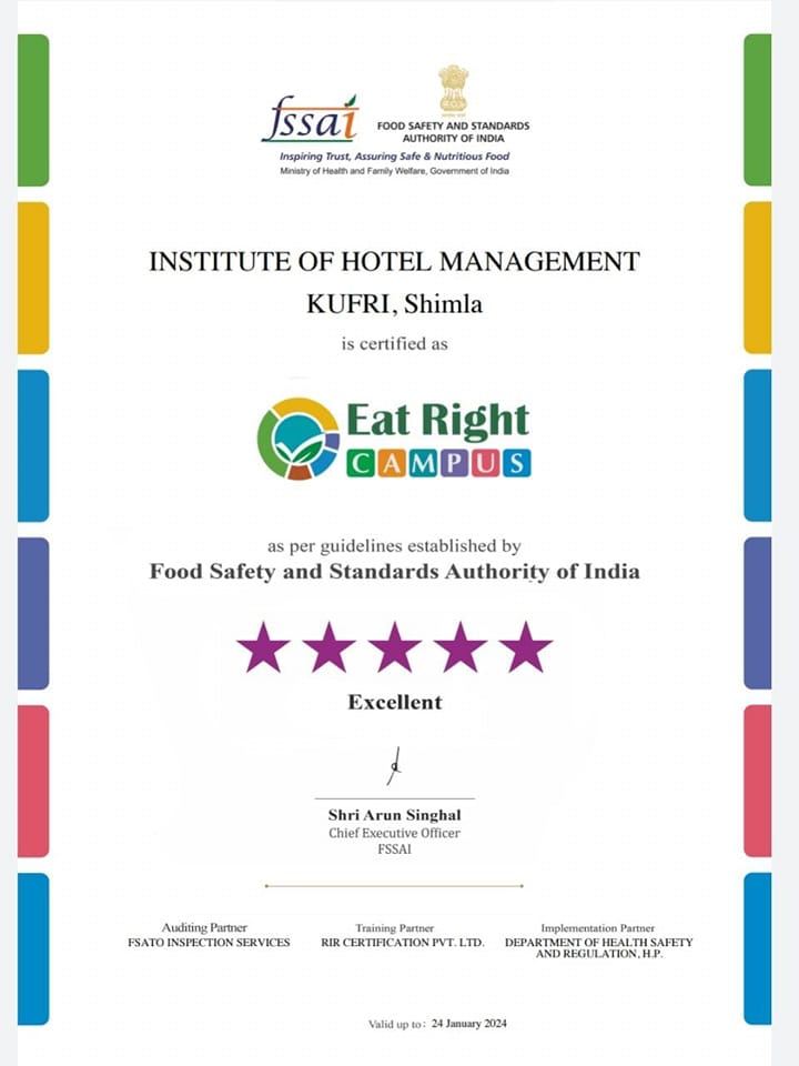 IHM Shimla awarded FSSAI Excellent "Eat Right Campus" certificate.