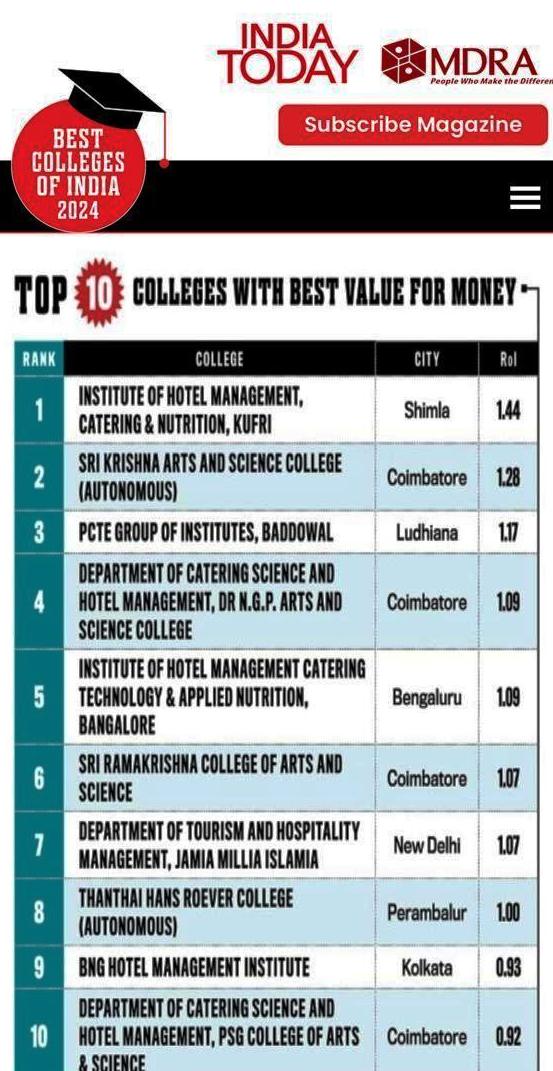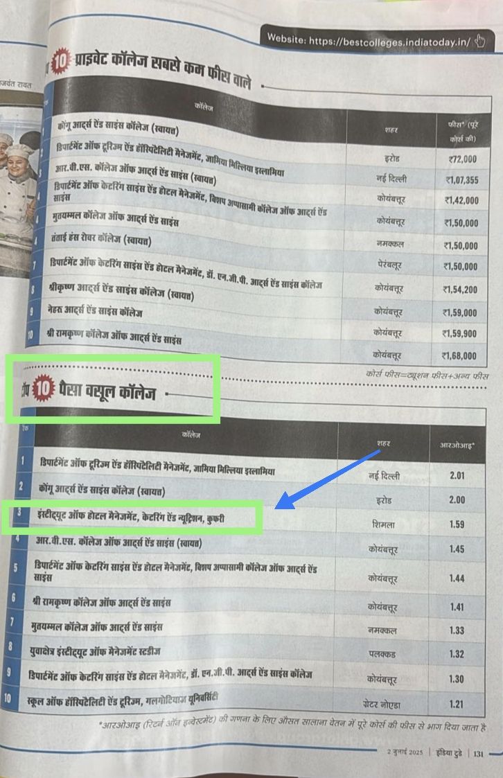 IHM Shimla Rank 1 in India Today best colleges of India 2024 best value for money.